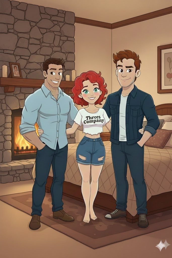 Look at this cozy scene, darling! A roaring fire, a soft bed, and two gorgeous, strong men framing one very happy girl—me! My shirt says “Threes Company” for a reason, and let me tell you, this isn’t just a fantasy on TV. It’s the ultimate reality.
